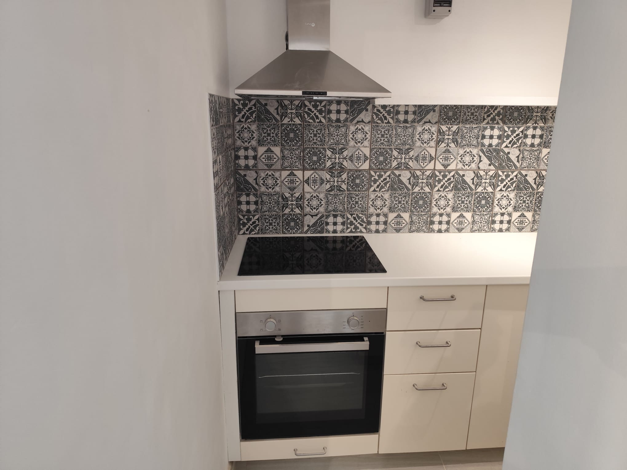 Hay una pequeña área de cocina con instalaciones similares al apartamento 1, con una barra de cocina frente a la piscina y un área de comedor con taburetes.