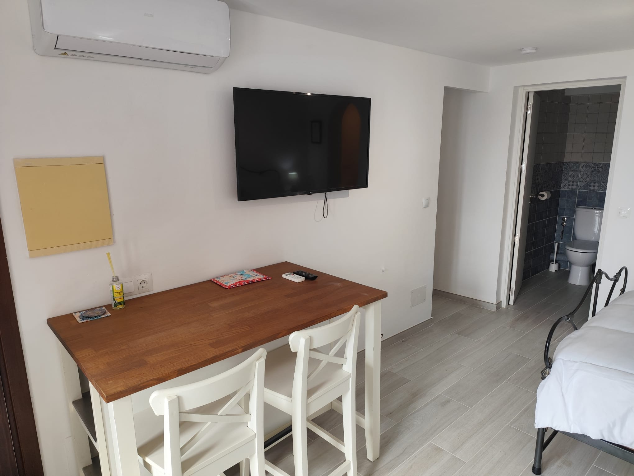 There is a small kitchen area with facilities similar to apartment 1, with a kitchen bar facing the pool and a dining area with stools.