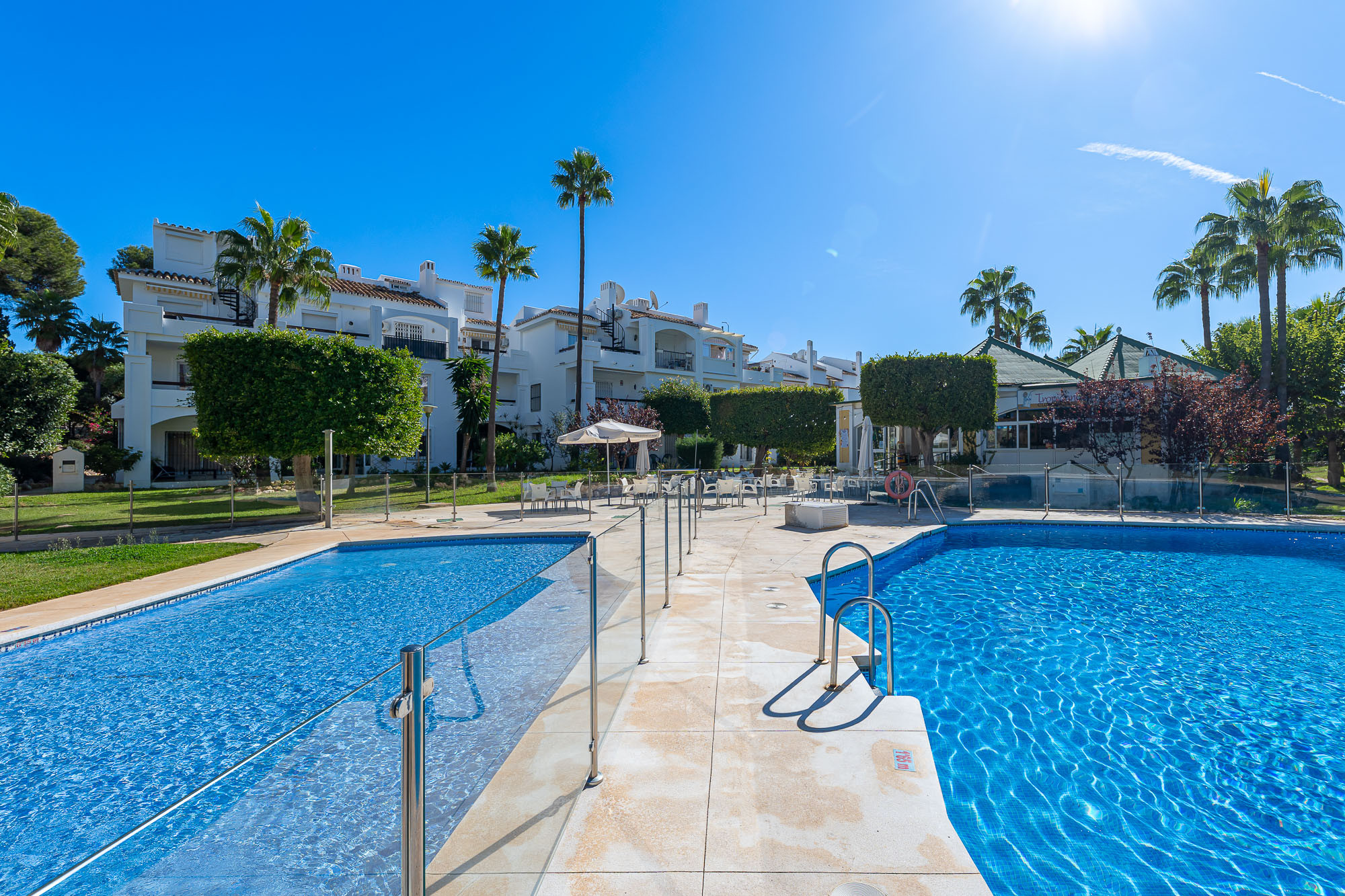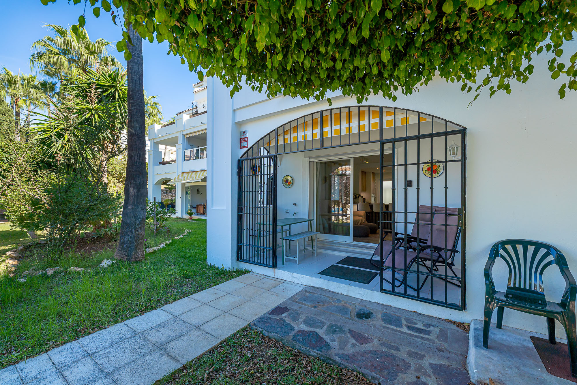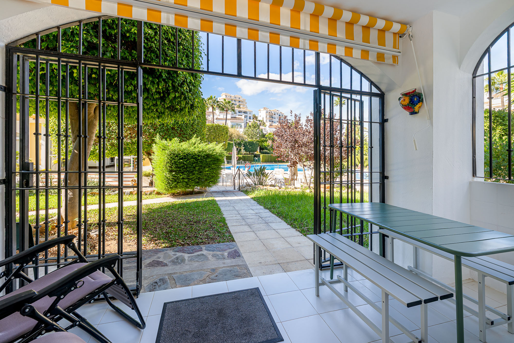Den/det lägenhet i Mijas Costa har 2 sovrum och en kapacitet för 6 personer. Boende av 89 m². Boendet är utrustat med följande föremål: trädgård, trädgårdsmöbler, 8 m² terrass, tvättmaskin, strykjärn, internet (Wifi), hårtork, värmepump, luftkonditionering, gemensam pool och barnpool, utomhus parkeringsplats in nära fastigheten, myggnät i hela boendet, 1 TV. Den/det Öppet kök, av induktion, är utrustat med kyl, mikrovågsugn, ugn, frys, diskmaskin, tallrikar/bestick, köksredskap, kaffemaskin, brödrost och vattenkokare