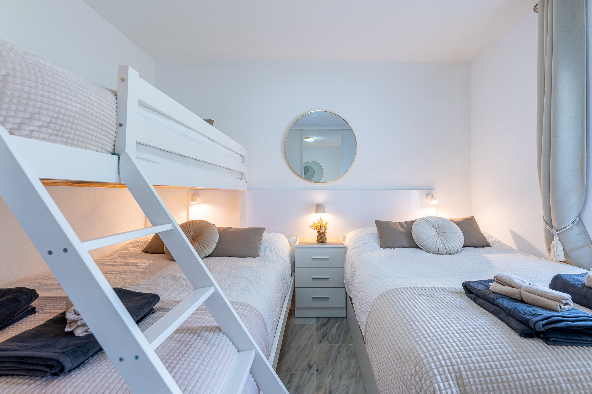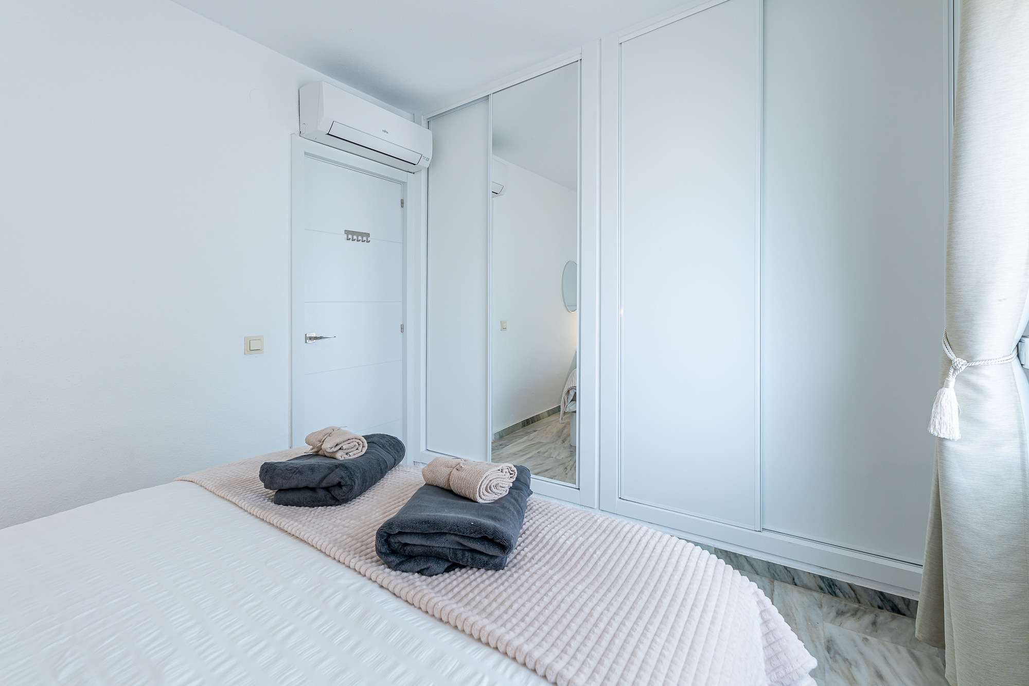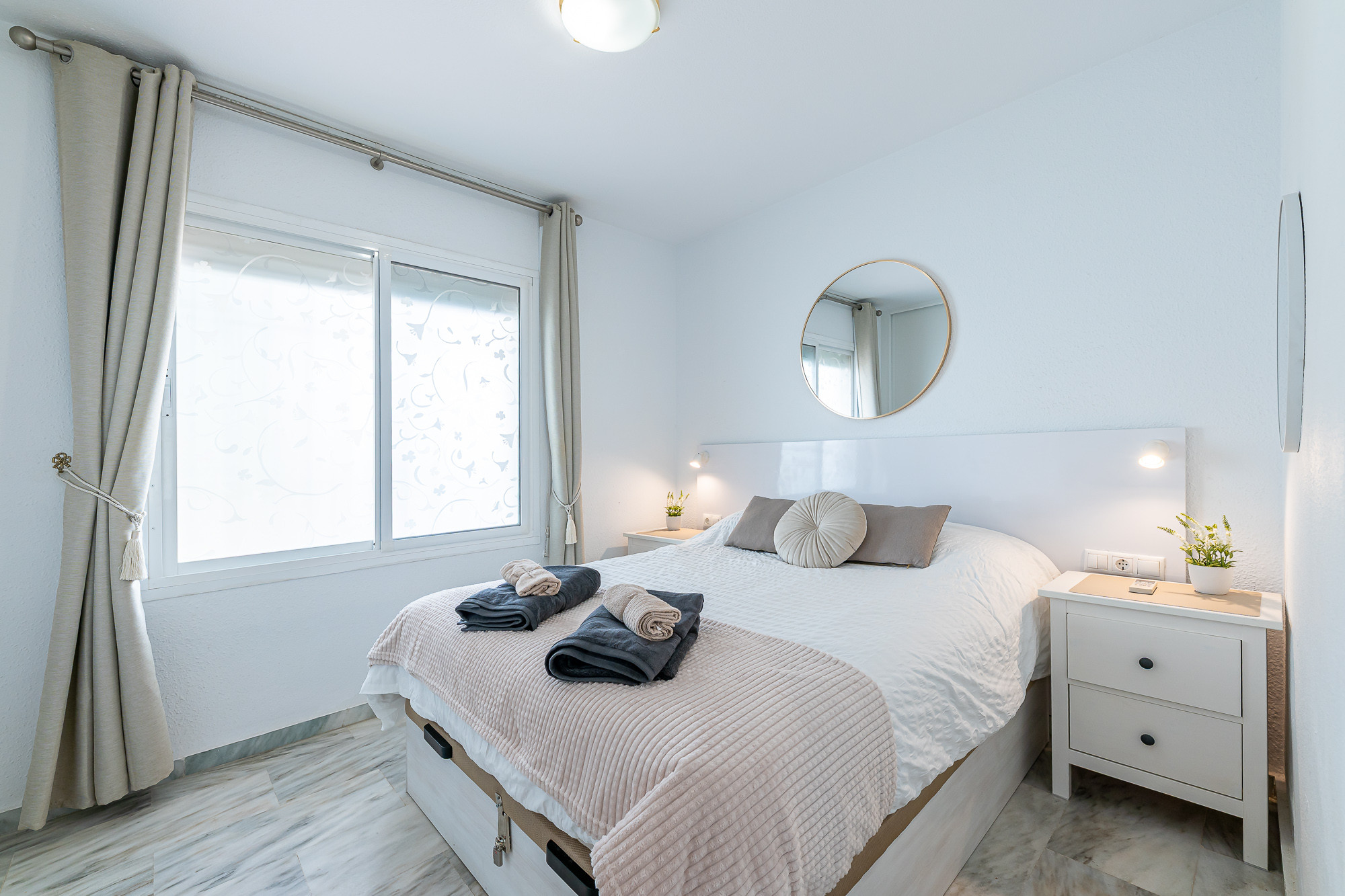 Den/det lägenhet i Mijas Costa har 2 sovrum och en kapacitet för 6 personer. Boende av 89 m². Boendet är utrustat med följande föremål: trädgård, trädgårdsmöbler, 8 m² terrass, tvättmaskin, strykjärn, internet (Wifi), hårtork, värmepump, luftkonditionering, gemensam pool och barnpool, utomhus parkeringsplats in nära fastigheten, myggnät i hela boendet, 1 TV. Den/det Öppet kök, av induktion, är utrustat med kyl, mikrovågsugn, ugn, frys, diskmaskin, tallrikar/bestick, köksredskap, kaffemaskin, brödrost och vattenkokare